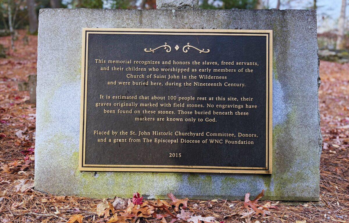 A bronze plaque at the base of the cross explains what is known: “This memorial recognizes and honors the slaves, freed servants, and their children who worshiped as early members of the Church of Saint John in the Wilderness and were buried here during the nineteenth century … Those buried beneath these markers are known only to God.”
