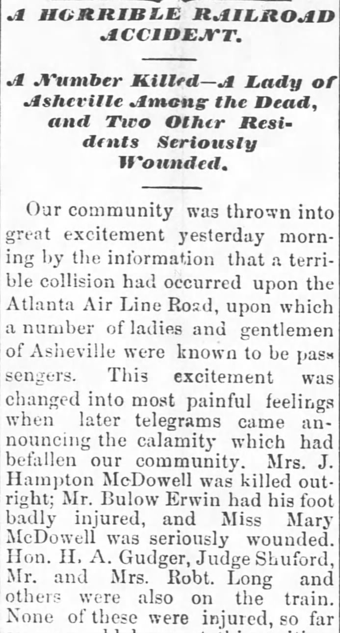 Her life ended on Oct. 20, 1887, when she was just 35 years old. McDowell’s death was tied to a major railroad disaster near Spartanburg, S.C. that stunned Asheville as telegraph reports arrived and residents waited for the names of the dead and injured.
