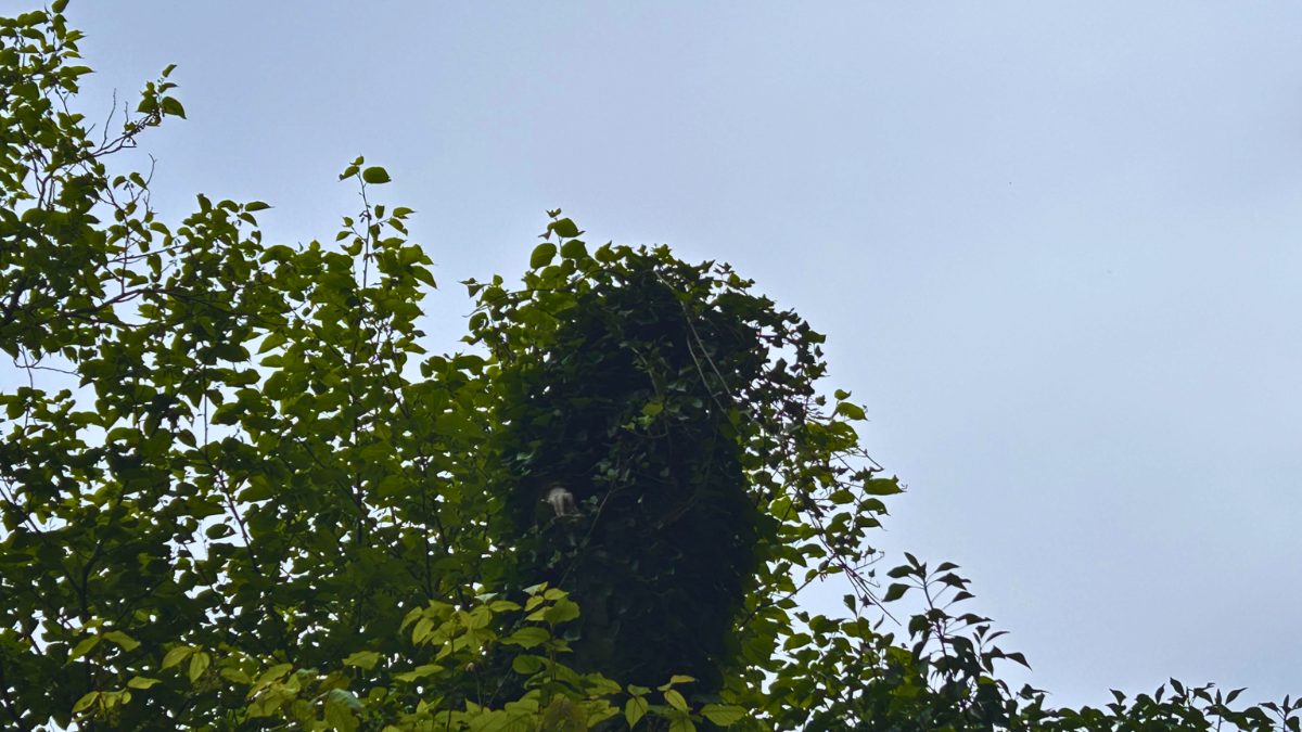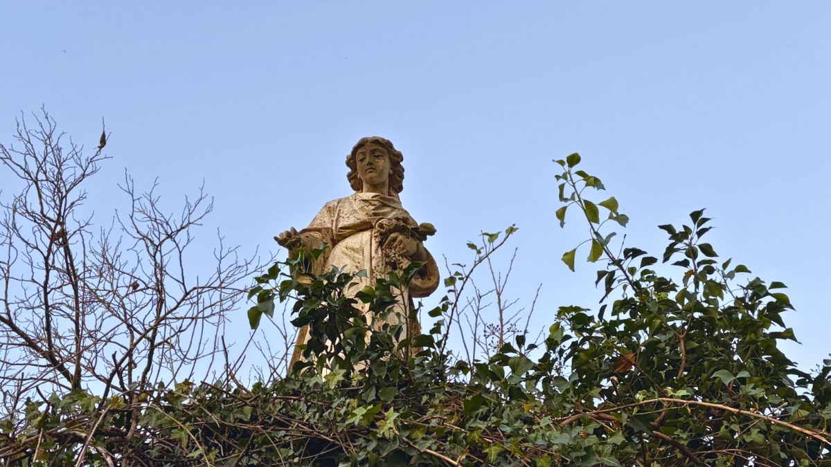 Most of the year, visitors walk past the mausoleum without noticing the statue above. English ivy covers the roofline, growing thick through the summer and only revealing the angel when colder weather slows the vine’s spread. The angel’s hidden presence gives the structure a mythic quality, seen only when nature allows it.