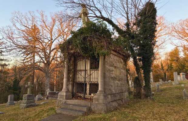 The McElveen mausoleum, lit by the low sun of late autumn, stands beneath bare trees in Asheville’s Riverside Cemetery. With ivy receding for the season, the marble angel above is once again revealed in full. Photo Source: Shannon Ballard.