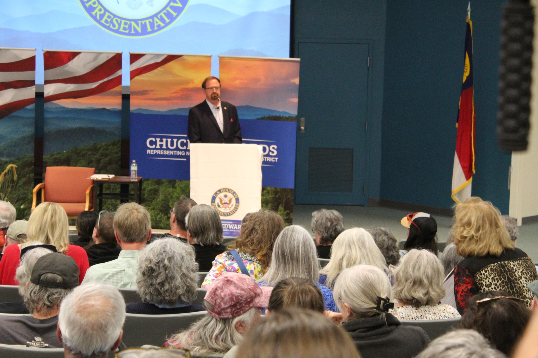 ASHEVILLE, N.C. (828newsNOW) — Thousands crowded Asheville-Buncombe Technical Community College’s Ferguson Auditorium on Thursday night, demanding answers from U.S. Rep. Chuck Edwards (NC-11).
