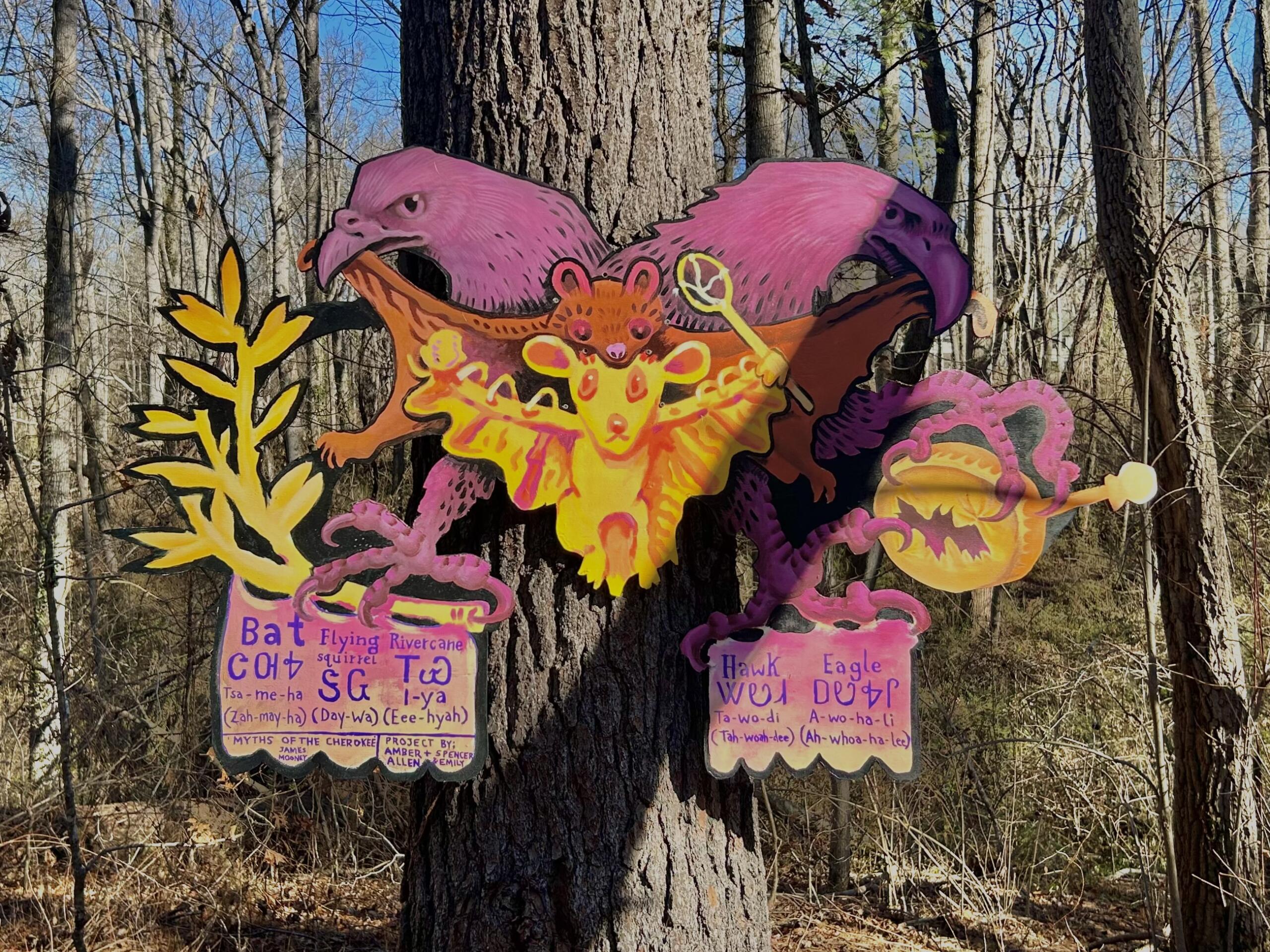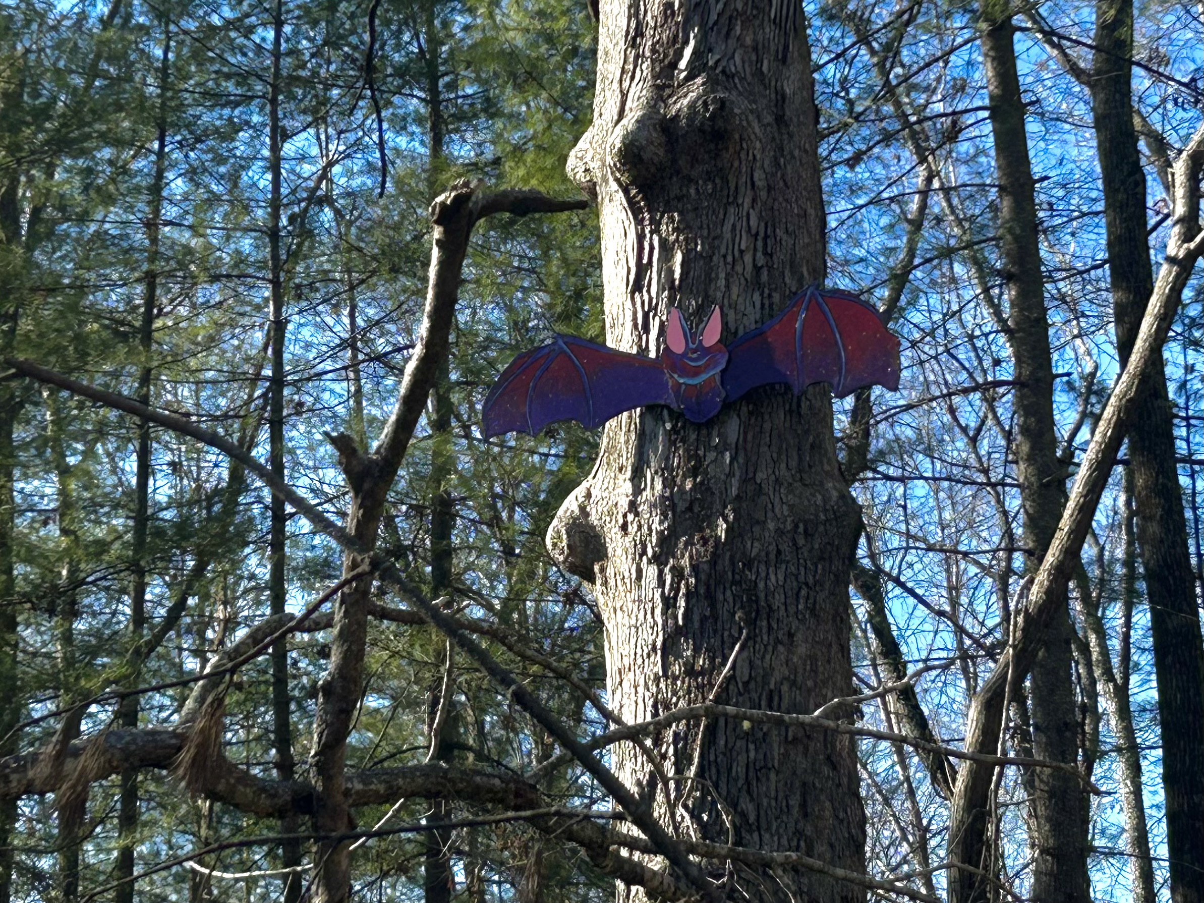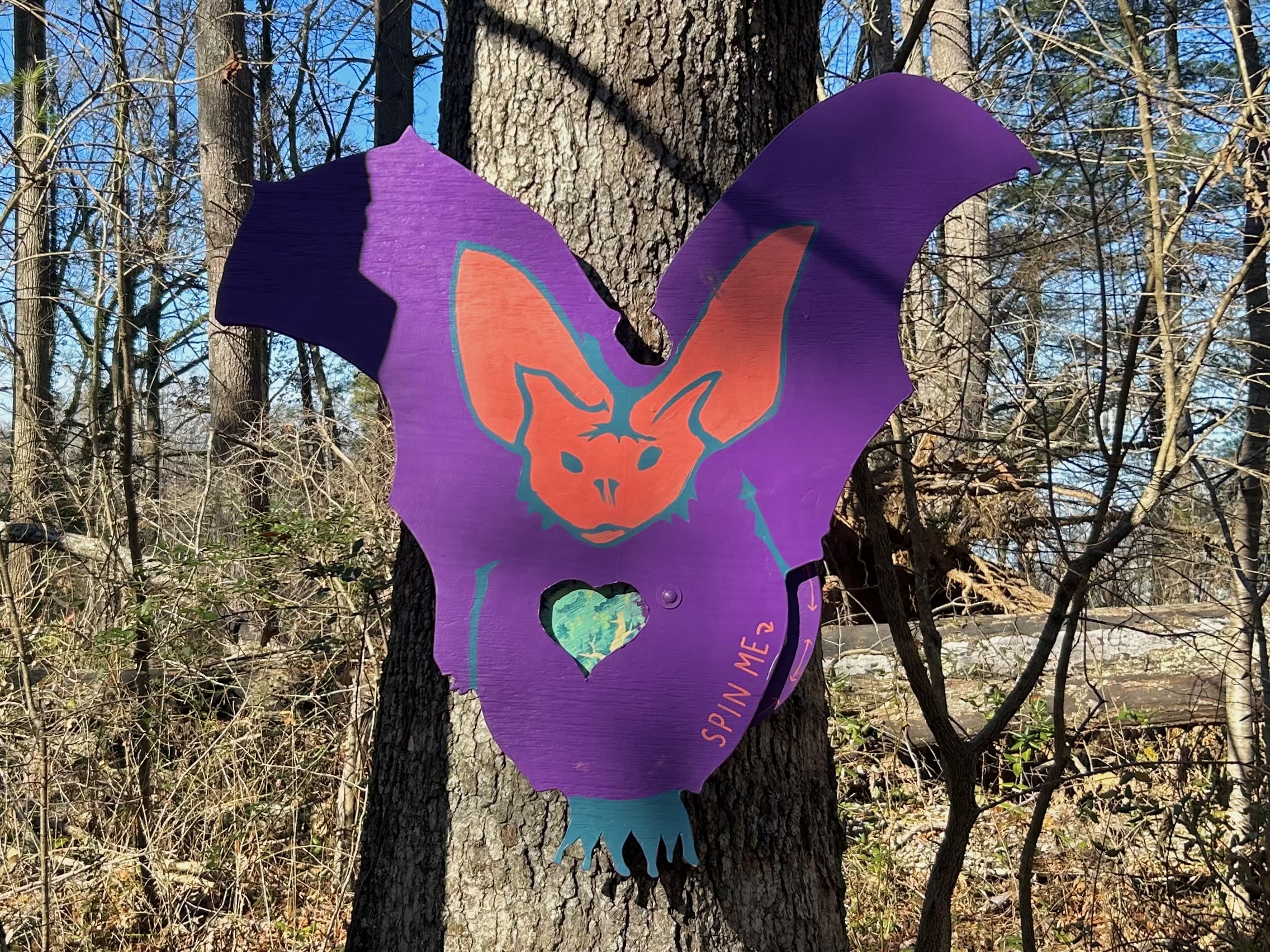 Batland was designed and implemented by Spencer Beals, a local artist passionate about “Save the Woods,” a community effort to preserve 45 acres of urban forest surrounding the Five Points neighborhood of North Asheville. Beals wanted the art project to spotlight what makes the acreage so valuable to the local community after UNC Asheville, which adjoins and owns the property, announced plans to develop new infrastructure on the land last year.