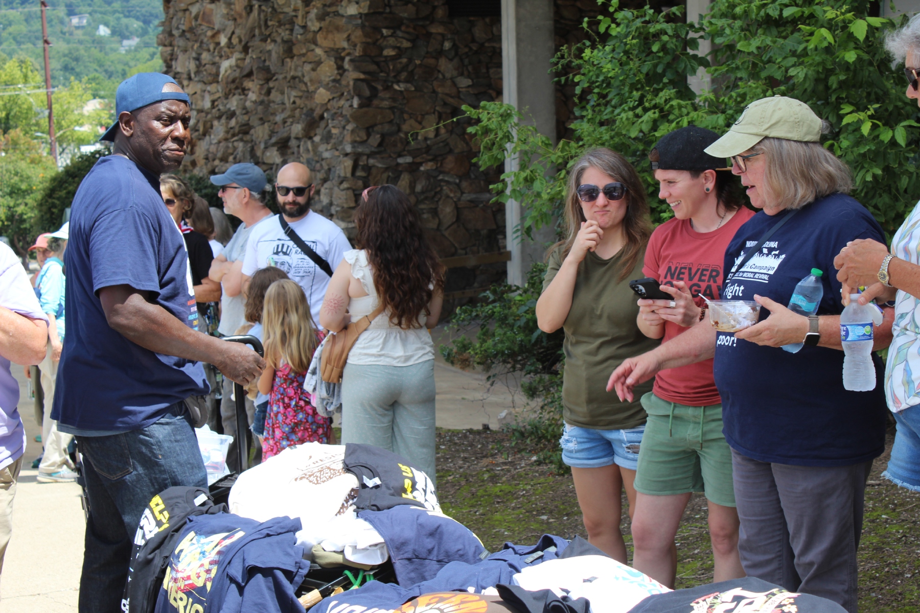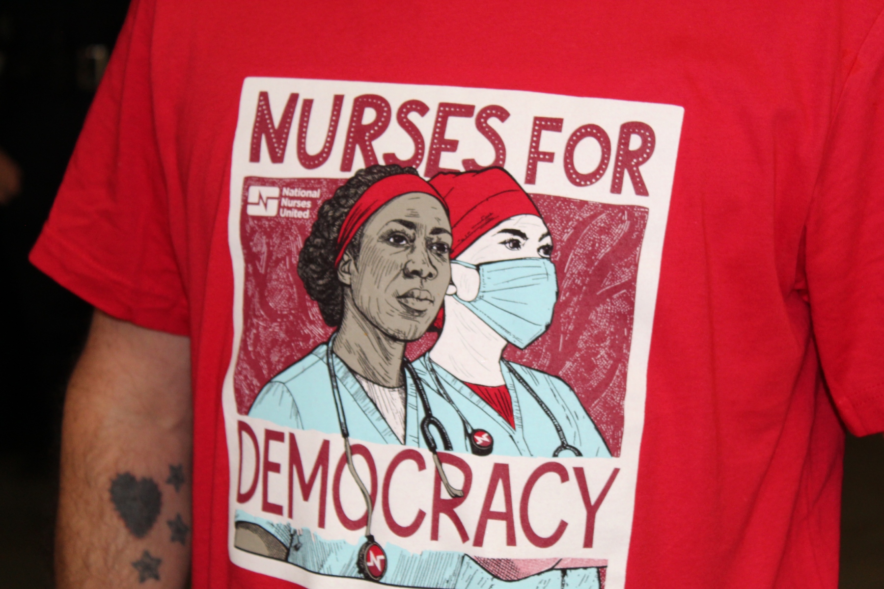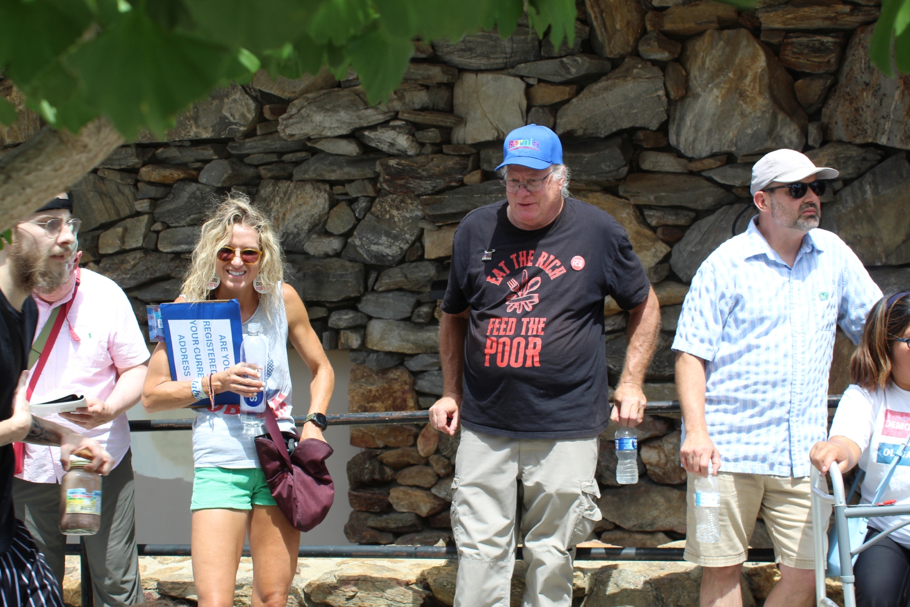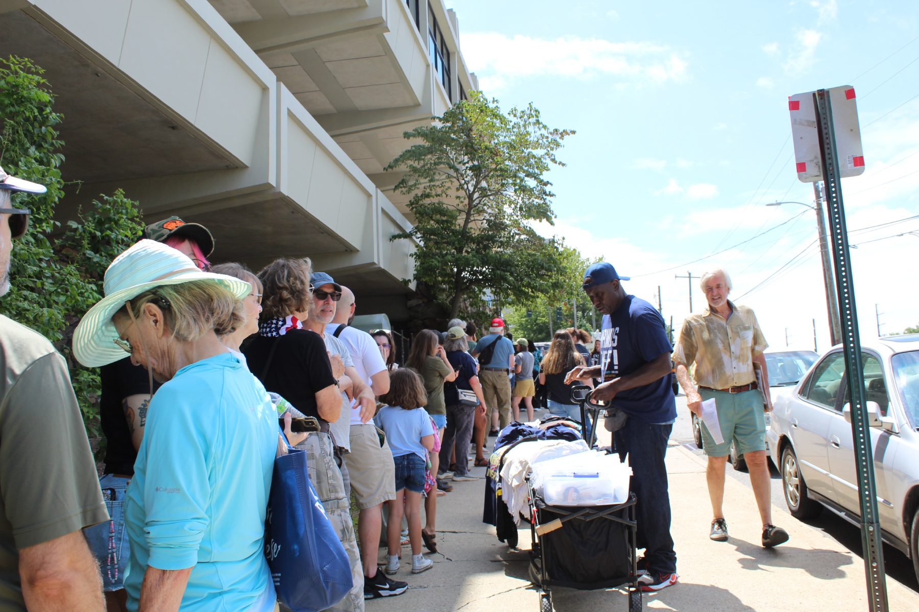 By early afternoon, the line of people waiting to enter stretched around the building. Attendees wore Sanders gear, union T-shirts and apparel advocating for democracy, civil rights and voter participation.