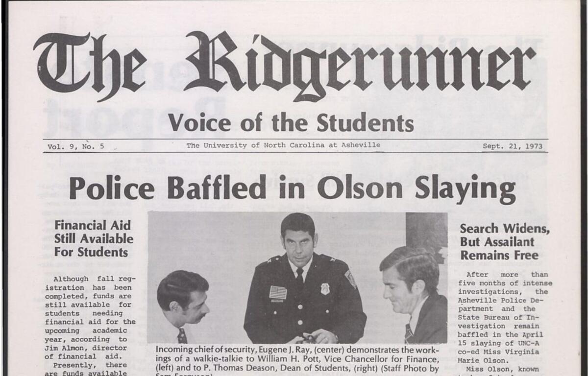 Olson was a student at UNCA when she was killed on an April afternoon in 1973. Investigators placed her at a secluded study spot near a large rock across W.T. Weaver Boulevard around 1 p.m. Her body was discovered roughly two hours later.