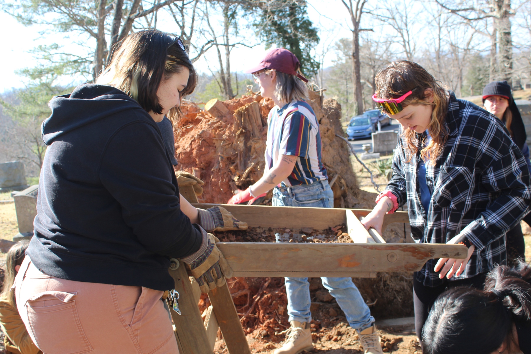 On Monday, the students were sifting dirt from under a rootball beside a cluster of graves.