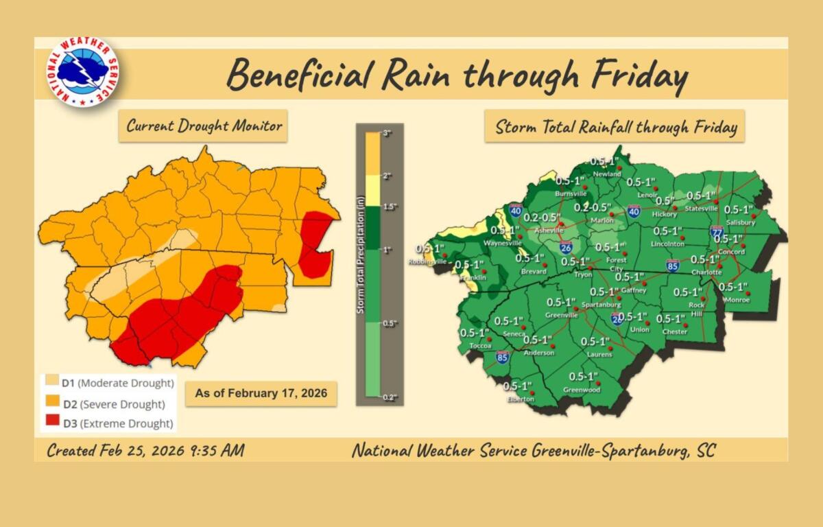 Storm totals are forecast to range from 1 to 2 inches across the mountains and from 0.5 to 1.25 inches in areas outside the mountains. Despite the steady rainfall, forecasters say the flooding threat remains minimal due to ongoing drought conditions, with the precipitation expected to provide beneficial moisture.