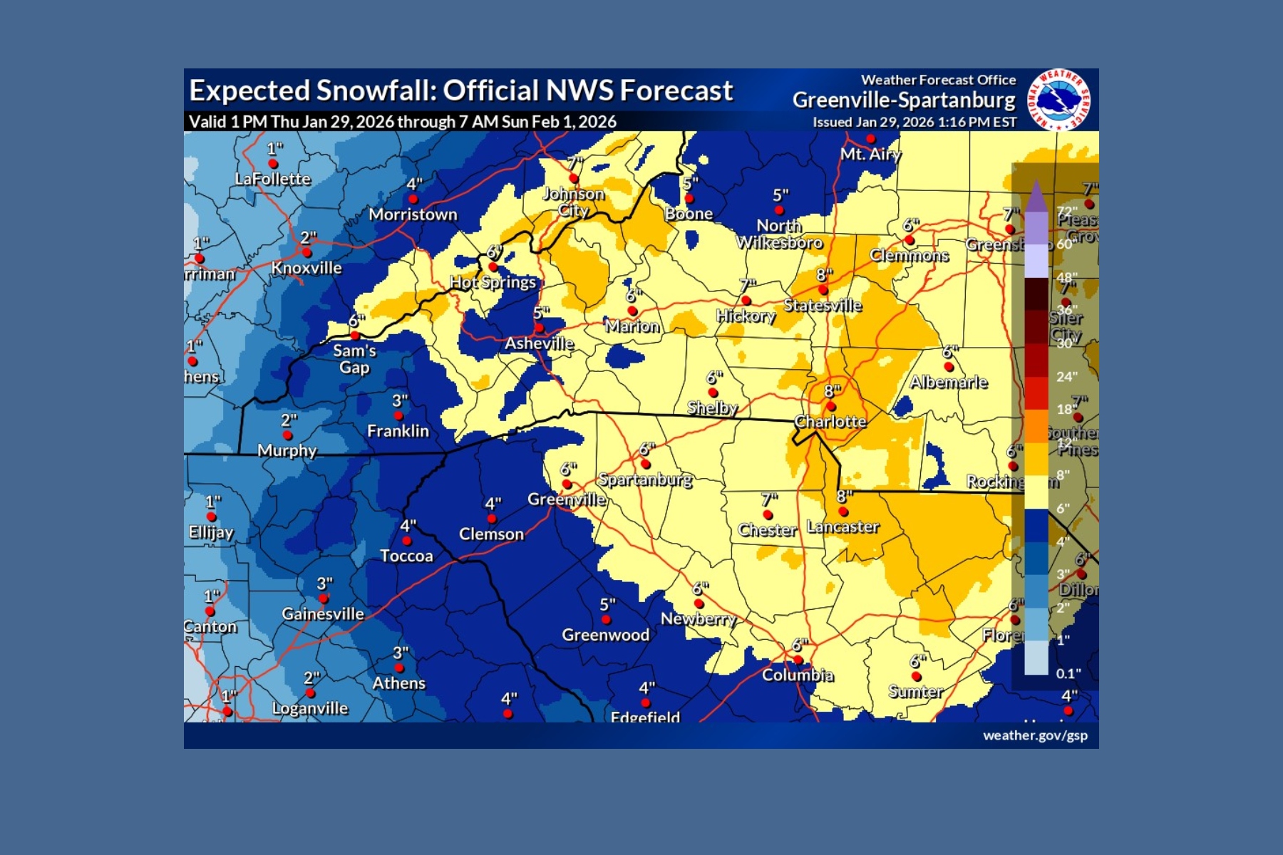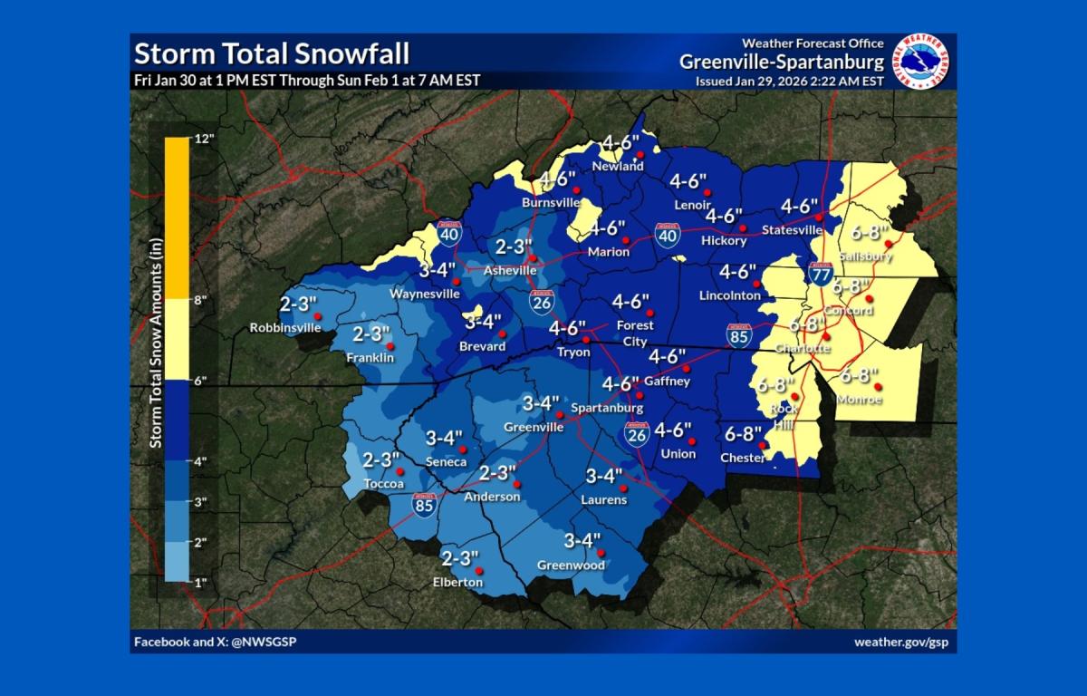 Current forecasts call for 2 to 4 inches of snow across much of the western half of the region and 4 to 7 inches across the eastern half and along much of the North Carolina-Tennessee border. Meteorologists noted snowfall projections have decreased slightly but could still reach warning-level criteria in many areas.