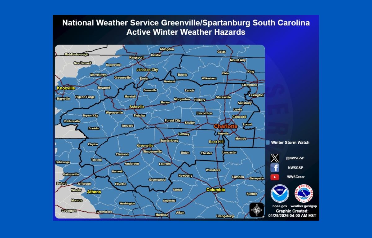 Statewide, the National Weather Service has issued a Winter Storm Watch for 98 of North Carolina’s 100 counties, with Cherokee and Clay counties excluded, according to North Carolina’s Weather Authority.