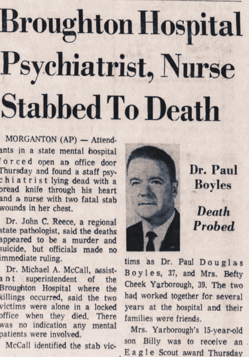 One of the most shocking events in Broughton’s history came in the early morning hours of April 22, 1971. Dr. Paul Douglas Boyles, a 37-year-old psychiatrist, and 39-year-old nurse administrator Betty Cheek Yarborough were found stabbed inside a locked room on Ward R.